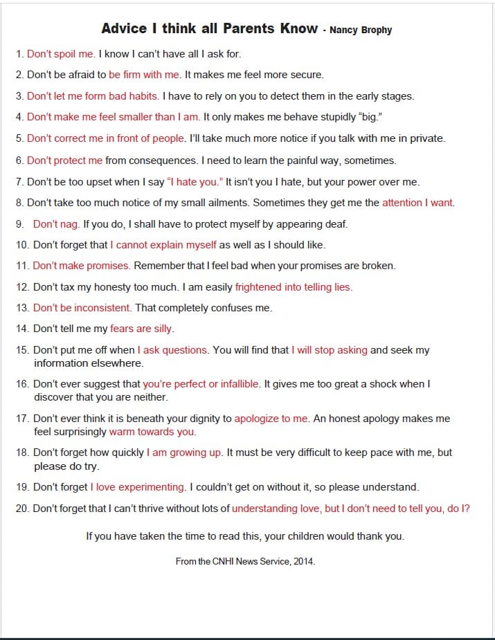 To view the PDF document, click on Advice I think all Parents Know