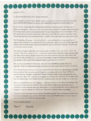 As our daughter’s time at Tom Thumb comes to an end, we wanted to extend our deepest and most heartfelt thanks to everyone who makes this program the special place it is.