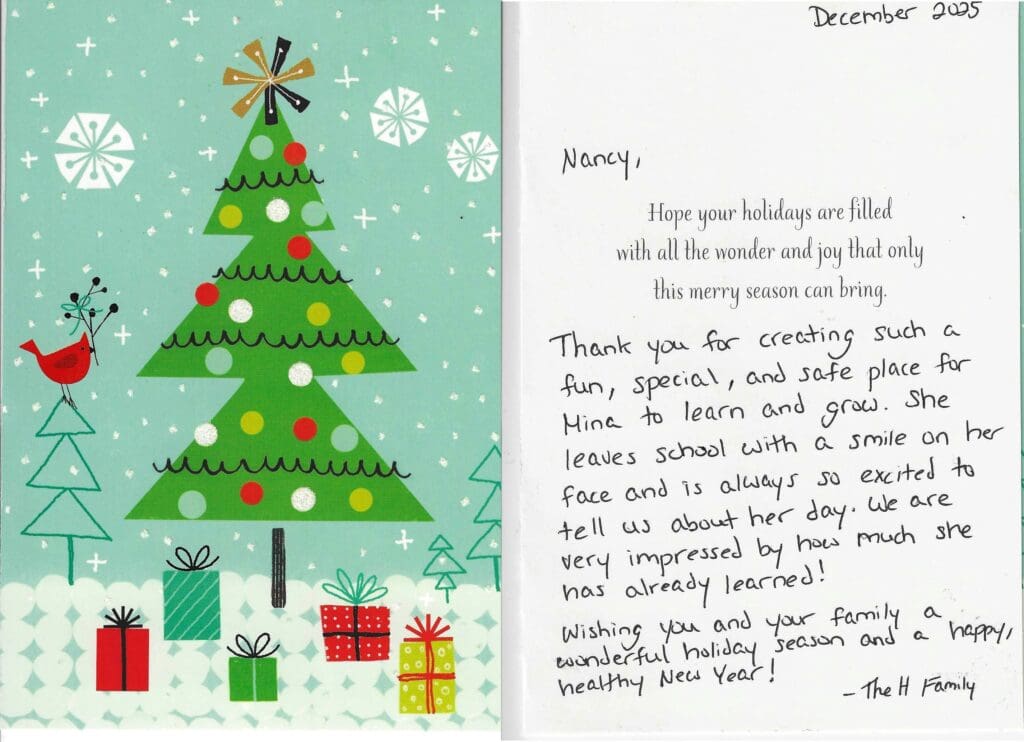 Thank you for creating such a fun, special, and safe place for Mina to learn and grow. She leaves school with a smile on her face and is always so excited to tell us about her day. We are very impressed by how much she has already learned!